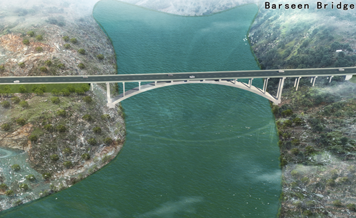 巴森橋全長225.3米,主拱凈跨徑達145米,是目前巴基斯坦跨度最大的拱橋。其建設環(huán)境極具挑戰(zhàn):地處喜馬拉雅強震帶的陡峭峽谷環(huán)境中,橫跨印度河東岸“V”字形沖溝,橋址區(qū)谷深約110米,地質條件復雜,施工難度位居項目前列。為攻克難題,項目團隊充分發(fā)揮中國企業(yè)在大跨徑拱橋施工領域的技術優(yōu)勢,采用懸鏈線無鉸拱結構與等高度單箱雙室截面設計,將橋梁劃分為23個節(jié)段,通過掛籃懸臂澆筑工藝逐段施工;同時依托精密計算與實時監(jiān)控技術,精準控制拱圈線形和結構應力,全程保障合龍精度與施工安全。
